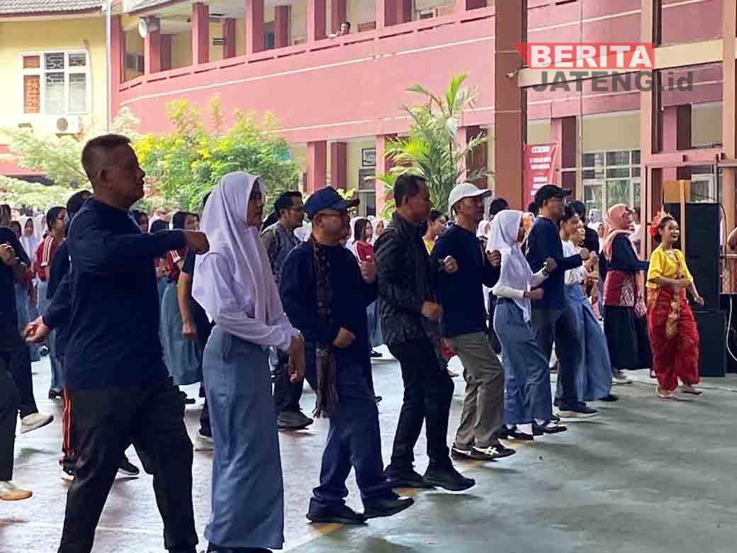 Menteri Pendidikan Dasar dan Menengah (Mendikdasmen) Republik Indonesia (RI) Abdul Mu'ti didampingi Bupati Kudus Sam’ani Intakoris saat mengikuti Gerakan Pagi Ceria di SMA 1 Kudus, Selasa (7/10). (Lingkar Network/Beritajateng.id)